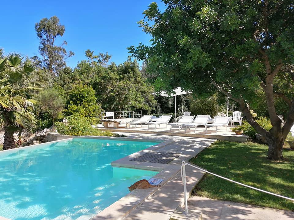 Nel cortile interno del corpo centrale della Masseria la piscina e il solarium vi attendono per un bagno rigenerante in un giardino ben curato con piante esotiche e mediterranee.