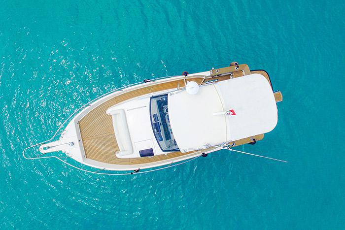 Sali a bordo della nostra Portofino Marine 750 WA a due motori Yanmar da 200 CV Turbo Diesel. Di colore nero e beige, con pavimentazione in tec, è dotata di spiaggetta per tuffi, console di comandi centrale, due GPS ed ecoscandagli. Comprende cabina con toilette, frigo, due posti letto ed ampio divano a prua. Max ospiti: 8.