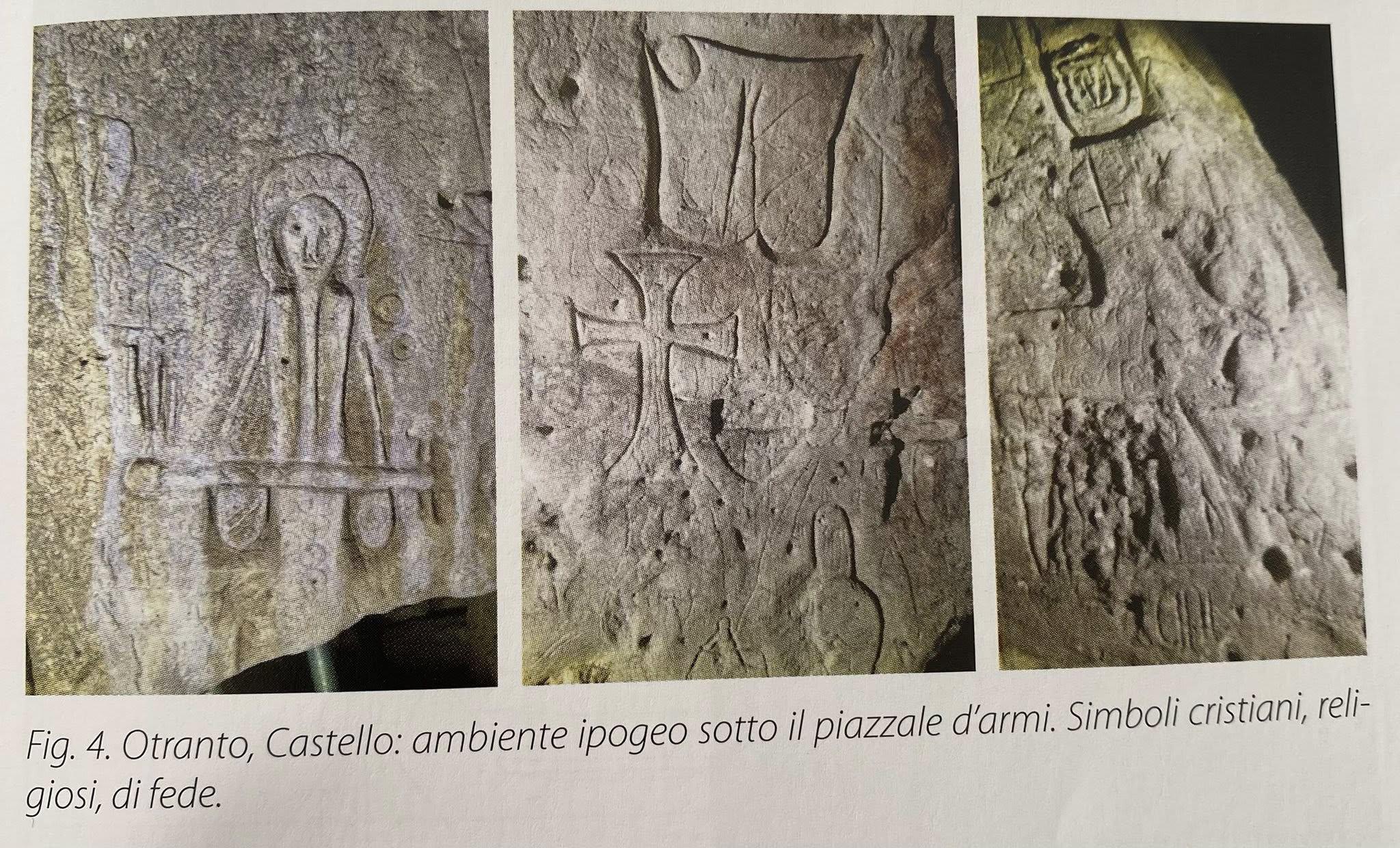 Nel 2013, duranti i lavori preliminari alla musealizzazione del Castello, è venuto alla luce un ipogeo. Nello specifico si tratta di un vano, ricavato nella roccia, nella zona sottostante la pavimentazione dell’atrio, di cui sono visibili in uno spazio superiore al mezzo metro di profondità solo due archi superiori, una serie di incisioni e raffigurazioni sulle pareti, di chiara matrice cristiana, tra le quali croci (sia greche che latine) e figure iconografiche. Al momento della scoperta si era ipotizzato che l’area potesse sorgere su un insediamento messapico e che rappresentasse una traccia del periodo paleocristiano, ma le immagini sulle pareti parrebbero fornire elementi successivi a quella datazione, collocando formalmente la cavità in un arco temporale vicino all’XI secolo, quindi, in epoca medievale.