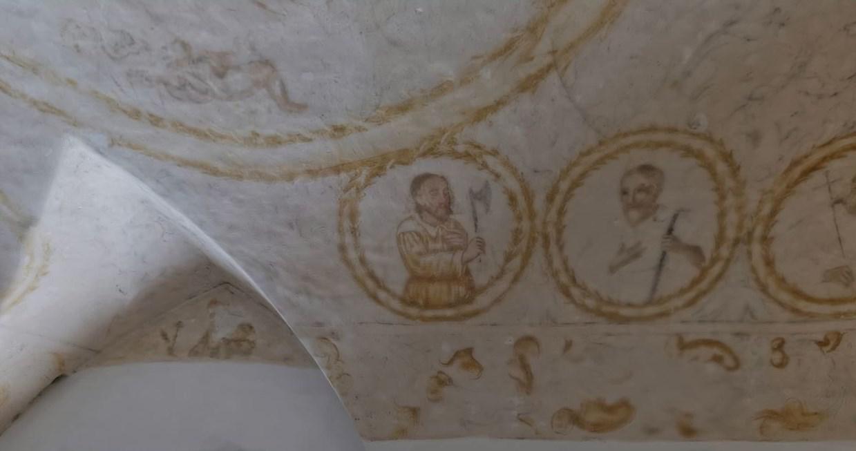 Il soffitto presenta sinopie ed affreschi raffiguranti al centro un tondo con l’Incoronazione della Vergine e lungo la parte bassa della volta una serie di medaglioni con figure sacre.